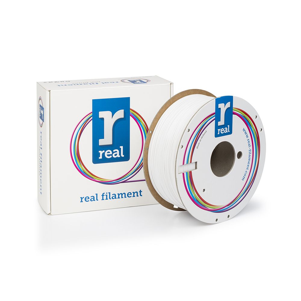 PETG filament White 1.75 mm 1000 g for 3D printers is of superior quality, produced in The Netherlands. Real filaments guarantees that the PETG is high-quality and diameter consistent filament, giving you the best 3D printing experience. PETG is great for beginners and novices alike, as it is easy to print and a sweet balance between printability and strong prints. The base material is very clear, so the neutral version delivers semi-transparent results. Within the Real brand we also have PETG available in translucent colors. As the print temperature is higher, the temperature resistance of the print is higher than other materials. If you experience (much) stringing, it is recommended to try a higher temperature.